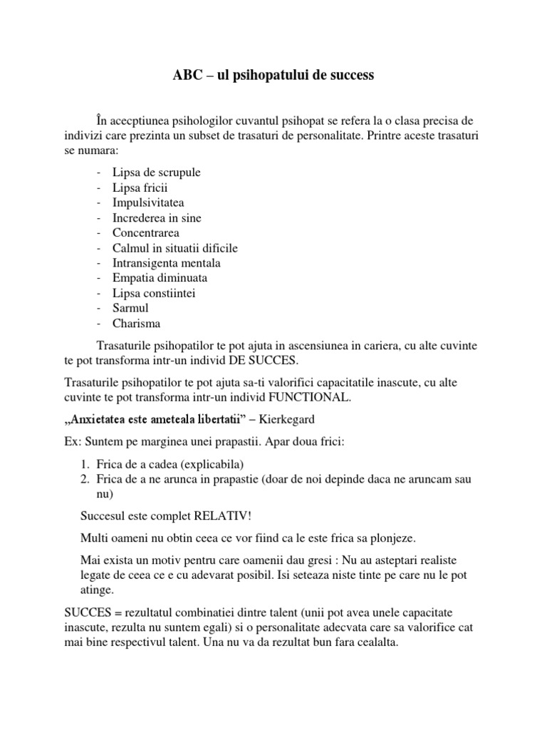 Când înlăuntrul uneia şi aceleiaşi persoane un intelect superior coabitează cu un temperament psihopatologic. Ve spun asta pentru cd existd uiz motiv pentru care sunt un om de succes. Se creează premisele ideale apariţiei unui geniu care are toate şansele să ajungă în dicţionarele biografice. În acecptiunea psihologilor cuvantul psihopat se refera la o clasa precisa de. 17 x 24 cm coperti:
