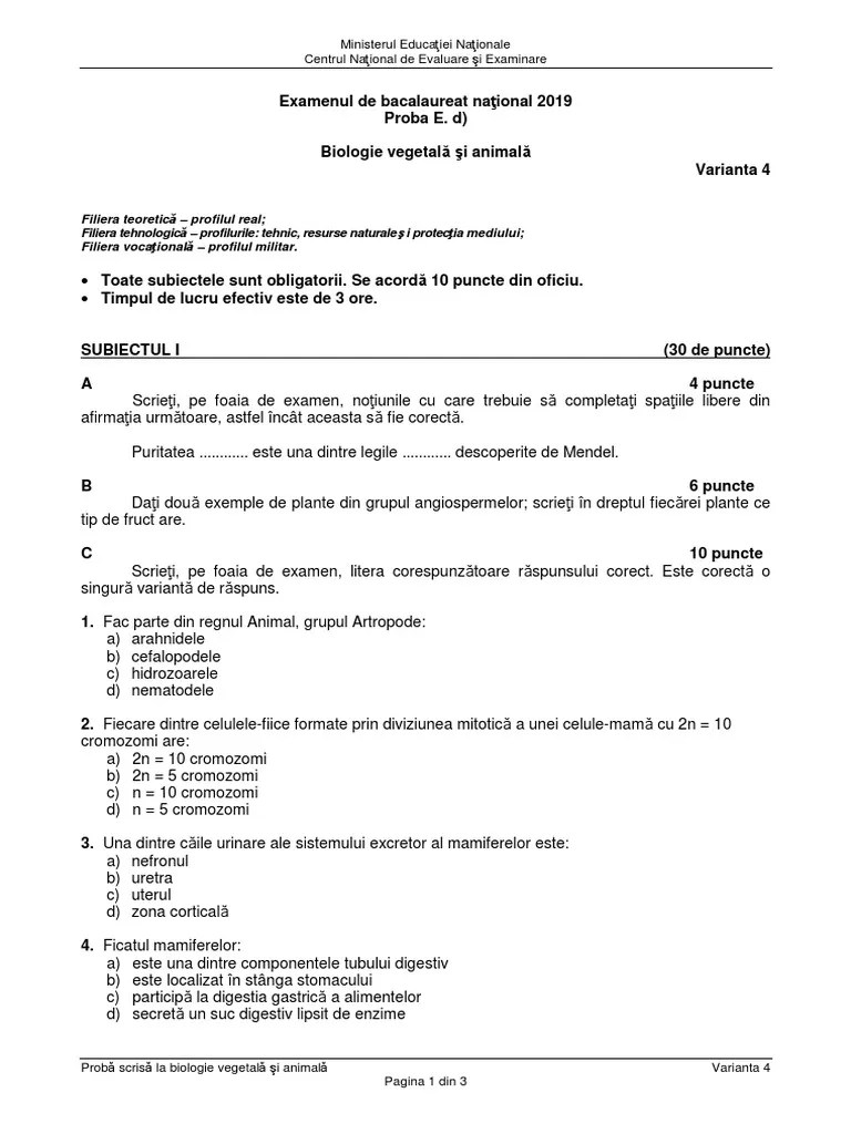 model de subiect biologie vegetală și animală bac 2017 (pdf). În funcție de specializare, elevii vor avea de ales o anumită materie. Ministerul educației a publicat noile modele de subiecte la bac 2019.subiectele nu conțin teste grilă, ci se respectă formatul anilor anteriori. Lista materiilor pentru bac în funcţie de profil a fost dată publicității de ministerul educației. model de subiecte la biologie model de subiecte la biologie când are loc a doua sesiune a bacalaureatului 2019 elevii care nu vor reuși să promoveze în această vară examenul de bacalaureat mai au o șansă în toamnă. Subiecte bac geografie 2013 : Deosebirile se pot referi la oricare dintre următoarele elemente climatice: La probele orale, materiile sunt comune, însă la probele scrise se diferențiază, în funcție de profilul studiat de candidat în liceu. Geografilia model subiect geografie bac 2019 : Subiecte simulare bac 2019 biologie. Modele de subiecte şi bareme bacalaureat 2020, 2019, 2018, 2017, 2016, 2015, 2014. E b limba şi literatura maternă Subiecte simulare bac 2018 edu.ro: